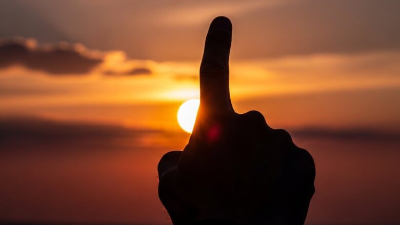 仕事で疲れた時、ふと目をやると、天道が指を天に突き上げている。