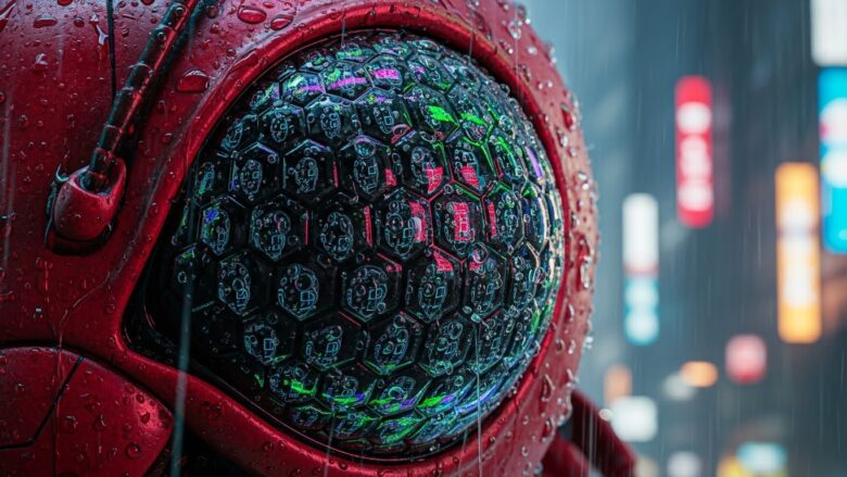 その雨粒の一つ一つが、ダイヤモンドのように輝き、カブトの赤い装甲を反射しているんです。