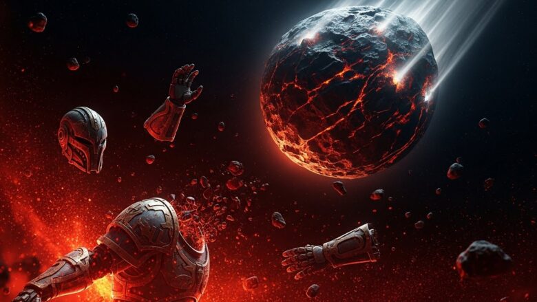 崩壊する瓦礫の中で、傷だらけになりながらも変身し、宇宙空間へと飛び立っていくカブト。
